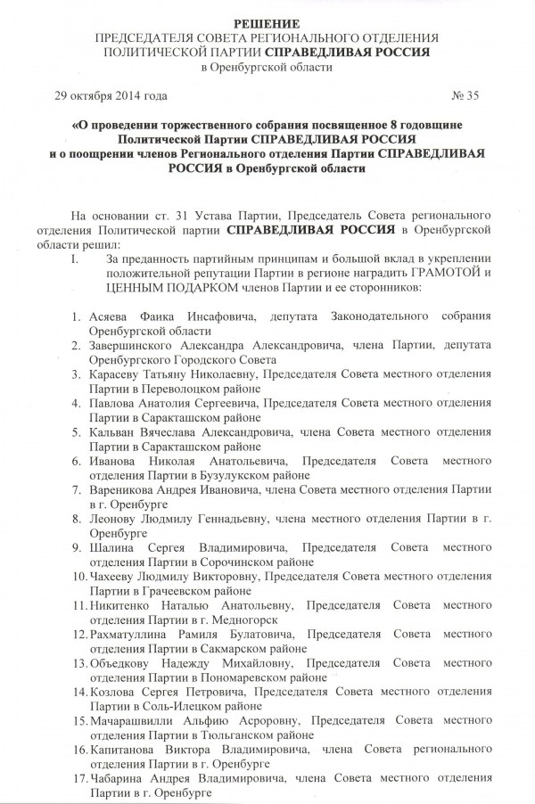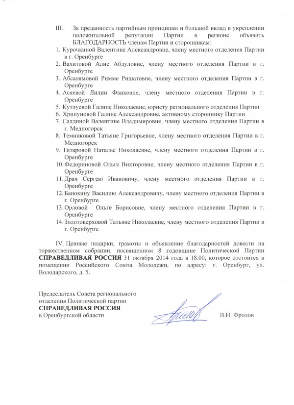 31 октября состоялось торжественное мероприятие по случаю празднования 8-й годовщины со дня создания Политической партии СПРАВЕДЛИВАЯ РОССИЯ. Празднество проходило в актовом зале Российского союза молодежи. В этот день на празднике собрались депутаты Законодательного собрания области, члены фракции "СПРАВЕДЛИВАЯ РОССИЯ", председатели местных отделений партии, члены совета регионального отделения, активисты и соратники партии СПРАВЕДЛИВАЯ РОССИЯ. Открывал торжественную церемонию руководитель фракции "СПРАВЕДЛИВАЯ РОССИЯ" в ЗС области Владимир Фролов: – Сегодня мы отмечаем восьмую годовщину со дня образования партии СПРАВЕДЛИВАЯ РОССИЯ! Можно с уверенностью сказать, что за этот срок СПРАВЕДЛИВАЯ РОССИЯ состоялась как серьезная политическая сила, вошедшая в Государственную Думу в качестве третьей политической фракции уже в двух её созывах. Сегодня в стране остро назрела потребность в справедливом устройстве общества, в человечном, ответственном отношении власти к своим гражданам. Ведь именно они составляют главную ценность и богатство нашей страны. СПРАВЕДЛИВАЯ РОССИЯ – первая за всю историю отечественного парламентаризма социал-демократическая партия, отстаивающая для России социалистическую перспективу. Мы сотрудничаем с общественными организациями, оказываем правовую и консультативную поддержку всякий раз, когда к нам приходят жалобы на произвол местных и региональных представителей органов власти. Что касается непосредственно нашего Оренбургского отделения, то и мы за эти восемь лет многого добились, многому научились. У нас есть депутат в Государственной Думе РФ, есть – фракция в составе 4 человек в Законодательном собрании Оренбургской области, есть депутаты и главы муниципальных образований на территории области. В области уже год работает Палата депутатов СПРАВЕДЛИВОЙ РОССИИ. Сегодня можно констатировать, что региональные власти вынуждены считаться с такой политической силой, как СПРАВЕДЛИВАЯ РОССИЯ, которая вопреки их желаниям идет своим самостоятельным курсом – курсом социальной СПРАВЕДЛИВОСТИ! ![]() По окончании торжественной части члены совета оренбургского городского отделения партии вручили грамоты и ценные подарки отличившимся активистам и старейшим членам партии, поблагодарили их за преданность партийным принципам и большой вклад в укрепление положительной репутации партии СПРАВЕДЛИВАЯ РОССИЯ в регионе. Затем состоялся сольный концерт в исполнении звезды оренбургской рок-музыки – Сергея Притуляка. Для всех присутствующих прозвучали песни разных лет и направлений: от шансона и авторской песни – до полюбившихся широкой публике музыкальных композиций советской и российской эстрады. А затем для всех приглашенных состоялся праздничный обед, без которого, пожалуй, не обходится ни один день рождения. ![]() ![]() ![]() ![]() ![]() |