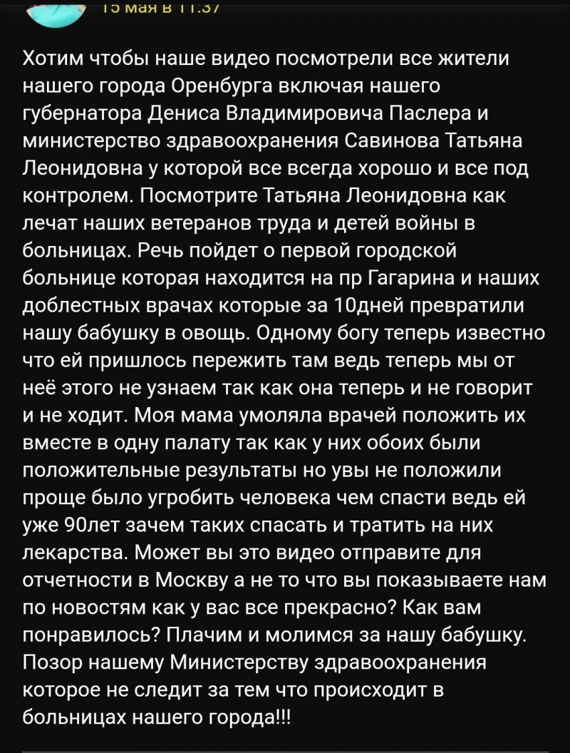 История о 90-летней женщине, которая не оправилась после 10-дневного лечения в городской больнице на пр. Гагарина в Оренбурге. Об этом рассказали родственники пожилого человека в социальных сетях два дня назад, и это вызвало общественный резонанс. ![]() Из сообщения, опубликованного в социальной сети, следует, что какое-то время назад женщина и её 90-летняя мама узнали о своем положительном тесте на коронавирус, им потребовалась госпитализация. Тогда оренбурженки хотели, чтобы их положили в одну палату, но медперсонал не пошел на уступки. После 10-ти дневного лечения родные испытали шок, увидев, в каком состоянии находится пожилая женщина. Вскоре она скончалась... Родственники бабушки в социальных сетях разместили публикацию, в которой обратились к министру регионального здравоохранения и к губернатору Оренбуржья, чтобы власти увидели, "как лечат ветеранов труда и детей войны в больницах". Фото и видео факты были выложены в открытый доступ тоже... Вскоре министерство здравоохранения Оренбуржья обратилось к родственникам пожилой женщины с просьбой о предоставлении данных пациентки. В ведомстве говорят, что ситуация серьезная, так как данные, которые распространены в СМИ, не совпадают с информацией, которой располагает Минздрав. ![]() Позиция Партии СПРАВЕДЛИВАЯ РОССИЯ – ЗА ПРАВДУ такова: ситуация, произошедшая с пожилым человеком, ужасна. Что касается информации о дочери пациентки, то она имеется в свободном доступе на личной странице в социальной сети, и её может посмотреть любой желающий. На той же интернет-странице указаны данные дочери (имя и фамилия). Возникает логичный вопрос: каких еще сведений не хватало Минздраву для тщательных проверочных мероприятий. "Ситуация – вопиющая. Проверка должна пройти предельно объективная и виновников должны непременно наказать. Не хотелось бы верить, что медицинские работники могут проявлять такое безолаберное отношение и неуважение к своим пациентам. Своими действиями такие горе-специалисты перечёркивают весь труд медиков, которые действительно отдают себя профессии. Пожилых людей должны лечить, а не залечивать. Мы выражаем глубокие соболезнования семье, которая столкнулась с такой бедой...", – комментирует лидер регионального отделения Партии СПРАВЕДЛИВАЯ РОССИЯ Оксана Набатчикова. Автор: Автор: Пресс-служба РО СР |