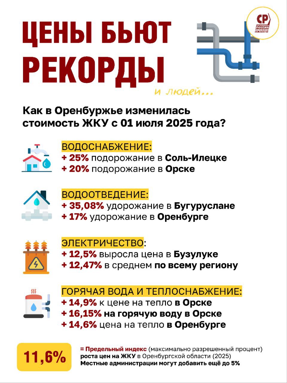 Предельный индекс повышения в этом году установлен для Оренбургской области на уровне 11,6% – предполагается, что цены вырастут не больше этого и так высокого значения. Но подорожания ставят рекорды: например, водоотведение в Бугуруслане (+25%) или водоснабжение в Соль-Илецке (+20%) – как так?