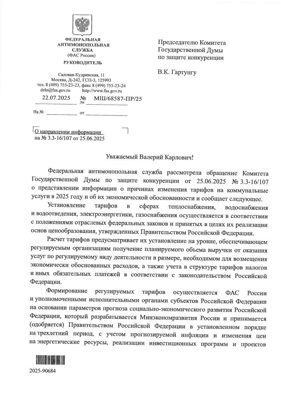 Ещё в конце июня по предложению Валерия Гартунга Госдума приняла протокольное поручение, согласно которому обоснованность роста тарифов должна было проверить ФАС. Ведомство прислало в Комитет по защите конкуренции официальный ответ.