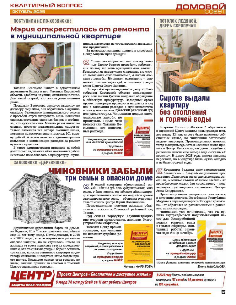 Ежемесячно наша партия выпускает полезные памятки в рамках Программы правового просвещения, в них – простые ответы на вопросы, с которыми к нам обращаются жители: как добиться положенных социальных выплат и компенсаций, проверить пенсию или защитить себя от незаконных взысканий, что делать с проблемами ЖКХ или как получить положенные по закону жилье или материнский капитал. В комплекте – газета для тех, кто любит свой дом. В каждом номере – реальные истории борьбы с несправедливостью, практические советы экспертов и простые лайфхаки и решения для облегчения жизни.