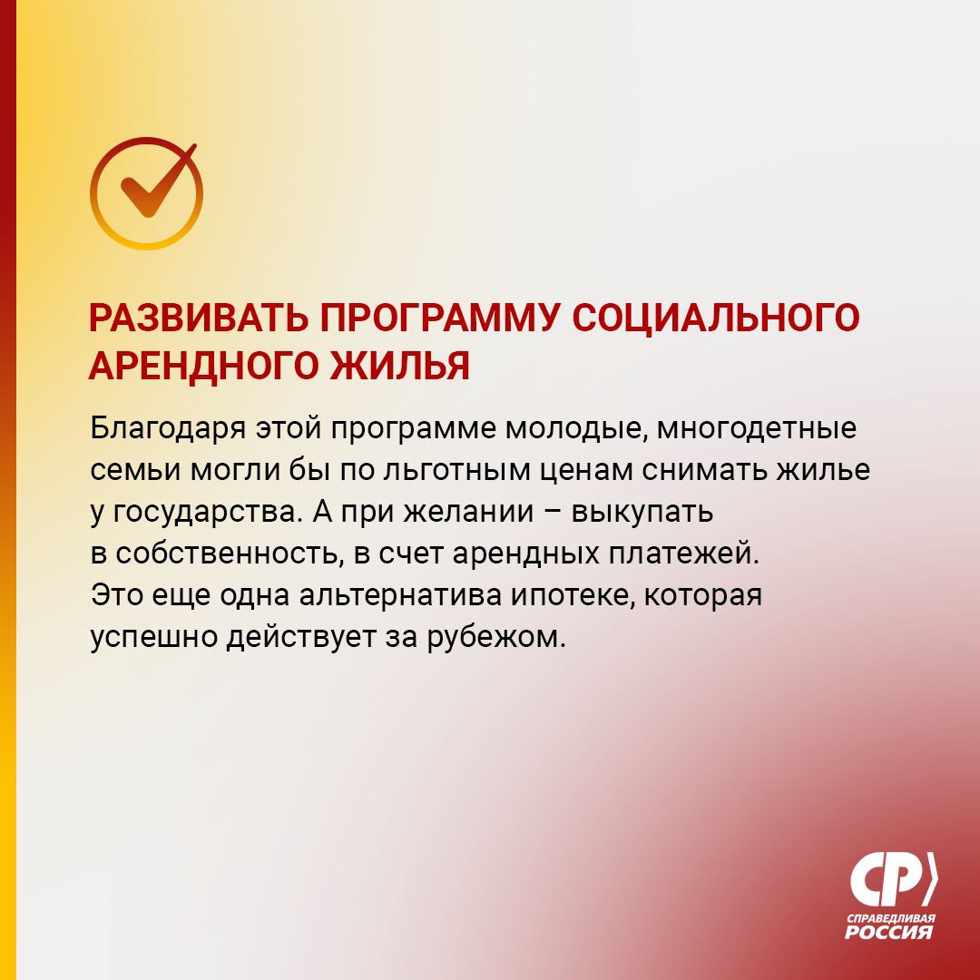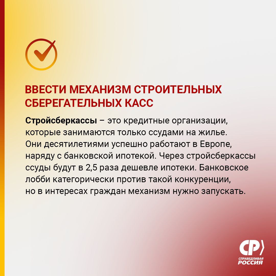 СПРАВЕДЛИВАЯ РОССИЯ много лет призывает Правительство, что не надо упираться в одну ипотеку. Нужны другие, конкурентные способы обеспечения граждан жильем. А при наличии альтернатив и банки будут делать ипотеку доступнее. В качестве альтернатив ипотеке мы предлагаем институт стройсберкасс и программу социальной аренды жилья.