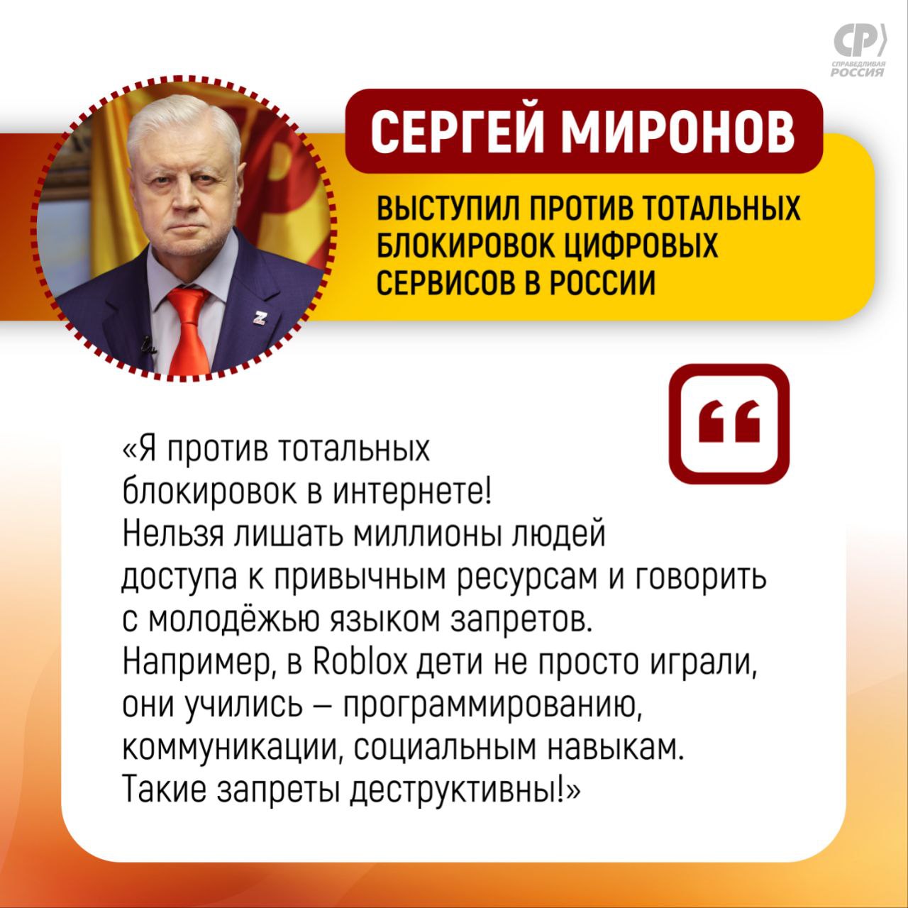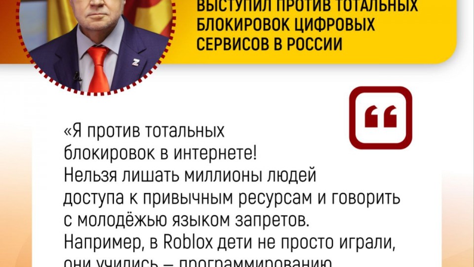 "Я против тотальных блокировок в интернете! Нельзя лишать миллионы людей доступа к привычным ресурсам и говорить с молодёжью языком запретов. Например, в Roblox дети не просто играли, они учились – программированию, коммуникации, социальным навыкам. Такие запреты деструктивны!" – отметил Сергей Миронов.