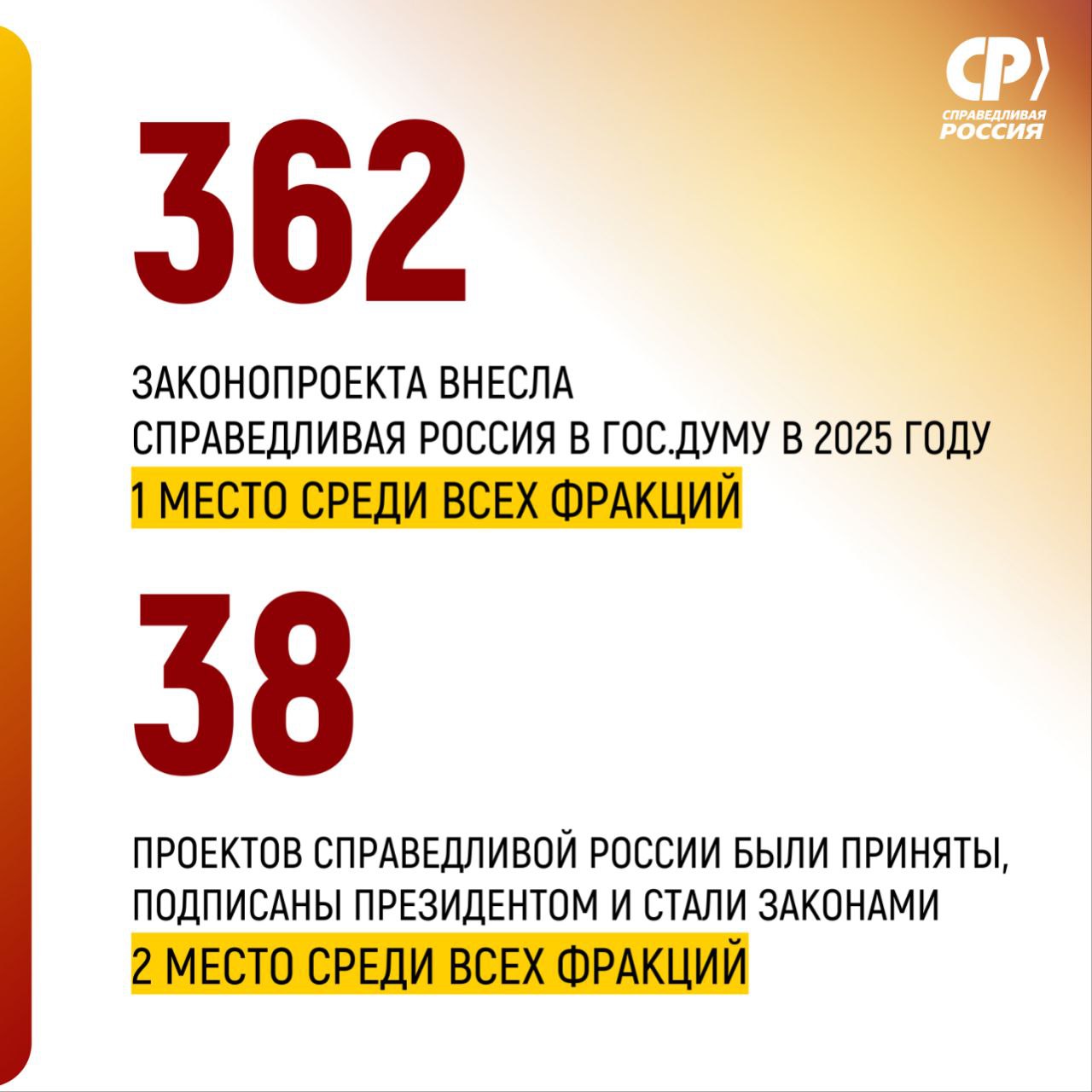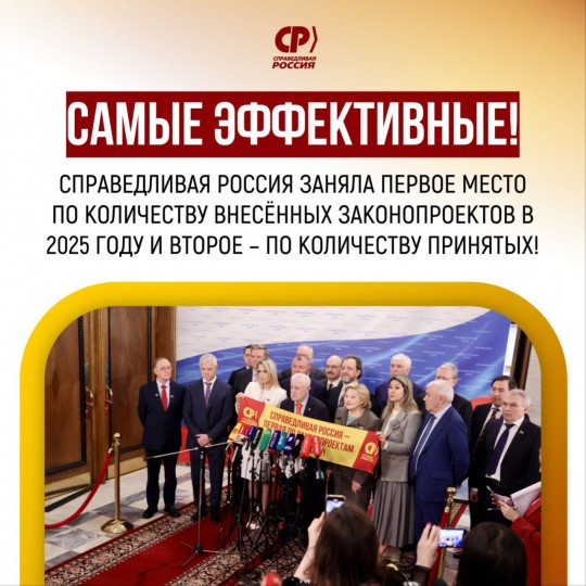 Мы обогнали и "партию большинства", у которой депутатов в 11 раз больше, чем у нас. В 2025 году справедливоросы внесли на рассмотрение Государственной Думы 362 законопроекта и вышли на первое место. Но главное не просто внести – предложения должны приниматься. И в этом году мы заняли II место по числу принятых проектов: 38 наших инициатив были подписаны Президентом и стали законами!