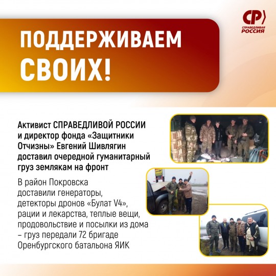 Многие наши партийцы помогают бойцам, их семьям в Оренбуржье и жителям освобожденных территорий регулярно. Чтобы поддерживать друзей и земляков на фронте организованно, Евгений Шивлягин создал свой фонд "Защитники Отчизны", который работает и сегодня – вместе с командой СПРАВЕДЛИВОЙ РОССИИ в Оренбуржье.